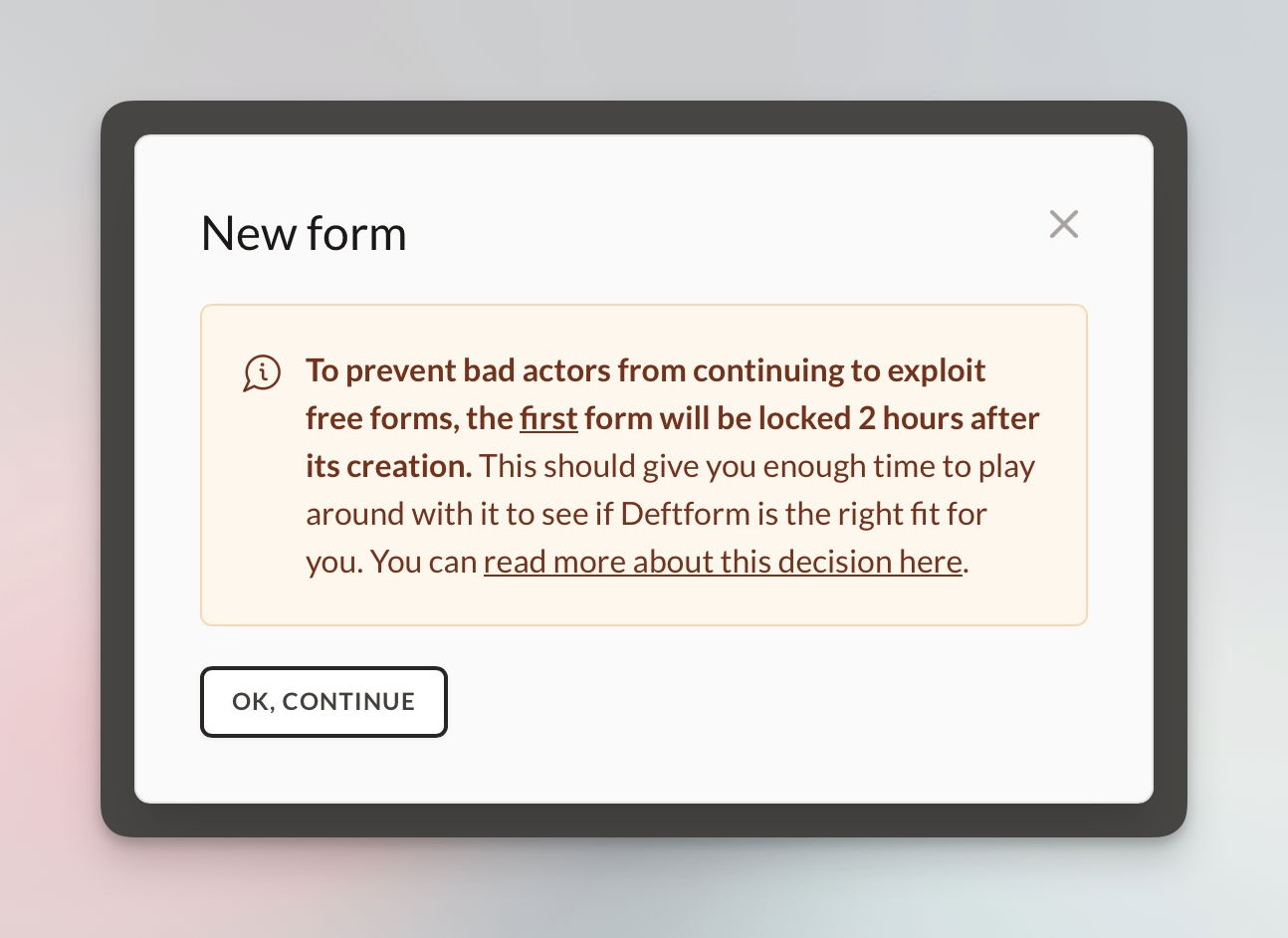 To prevent bad actors from continuing to exploit free forms, the first form will be locked 2 hours after its creation. This should give you enough time to play around with it to see if Deftform is the right fit for you.