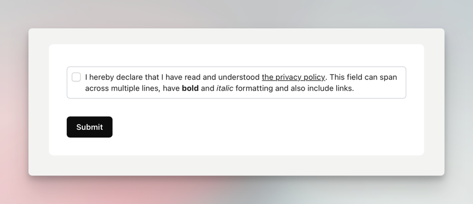 Opt-in checkbox The "Opt-in checkbox" enables you to add a checkbox element with additional text and minor formatting options. This is best suited to be placed as the last field, right before the submit button.