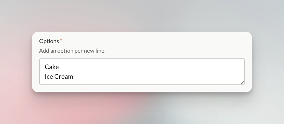 You can add as many options as you need while creating or editing the field. To pre-select any of the options, add |* (Pipe and Asterisk) directly behind the value. So for example, Cake|* would make it pre-selected when viewing the form.