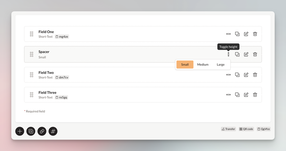 Spacer The "Spacer" element allows you to create a blank space between form fields. You can choose between 3 sizes: "Small", "Medium" and "Large". Here is an example of how the "Large" space looks like: