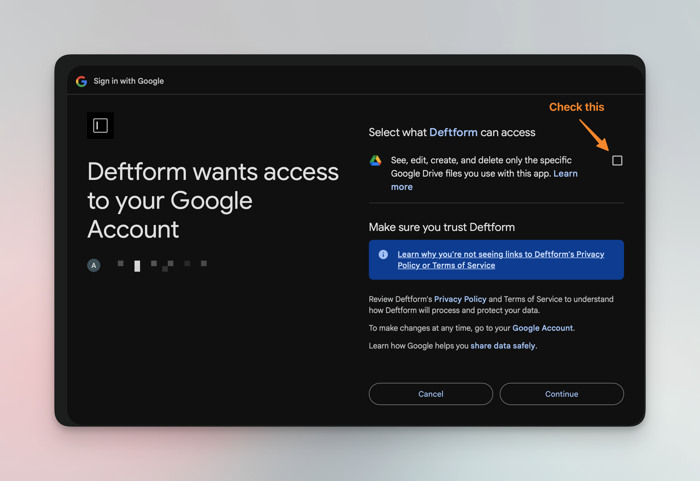 Please make sure to enable the checkbox asking for Google Drive access. Don’t worry, we only have access to files that were created by Deftform via the Google API.