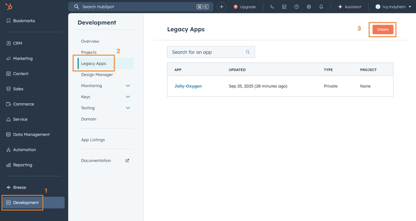 With our direct HubSpot integration, you can add or update contacts in your CRM. To get started, you will need to create an "Access token" in your HubSpot account. Login to your account, then find the "Development" section and create a "Legacy App".