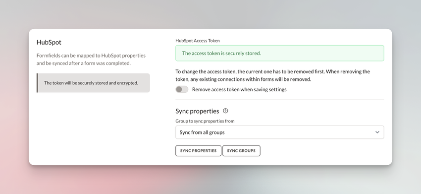 Next up, login to your Deftform account and head over to the "Connection" settings at https://deftform.com/settings/connect#hubspot. After your saved your settings, go back to the same section and sync your HubSpot groups and properties.
