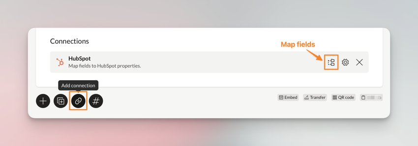 Now that we know about the existing fields in your HubSpot account, you can create a connection for your form and map the fields. Go to any of your forms. At the bottom, you will find the "Add connection" option, choose "HubSpot". When the connection is added, you can start mapping your fields.
