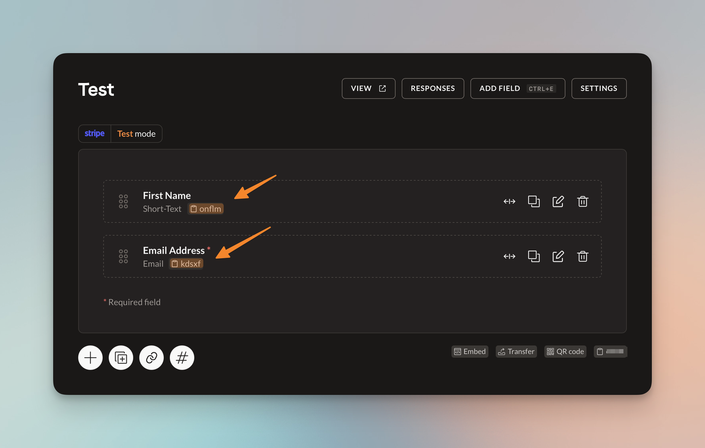 In case you want to pre-fill certain fields from external sources, you can make use of our custom field identifiers. This can be useful if you're running a survey or anything and want to pre-fill a customer email address, id or name to the form.
