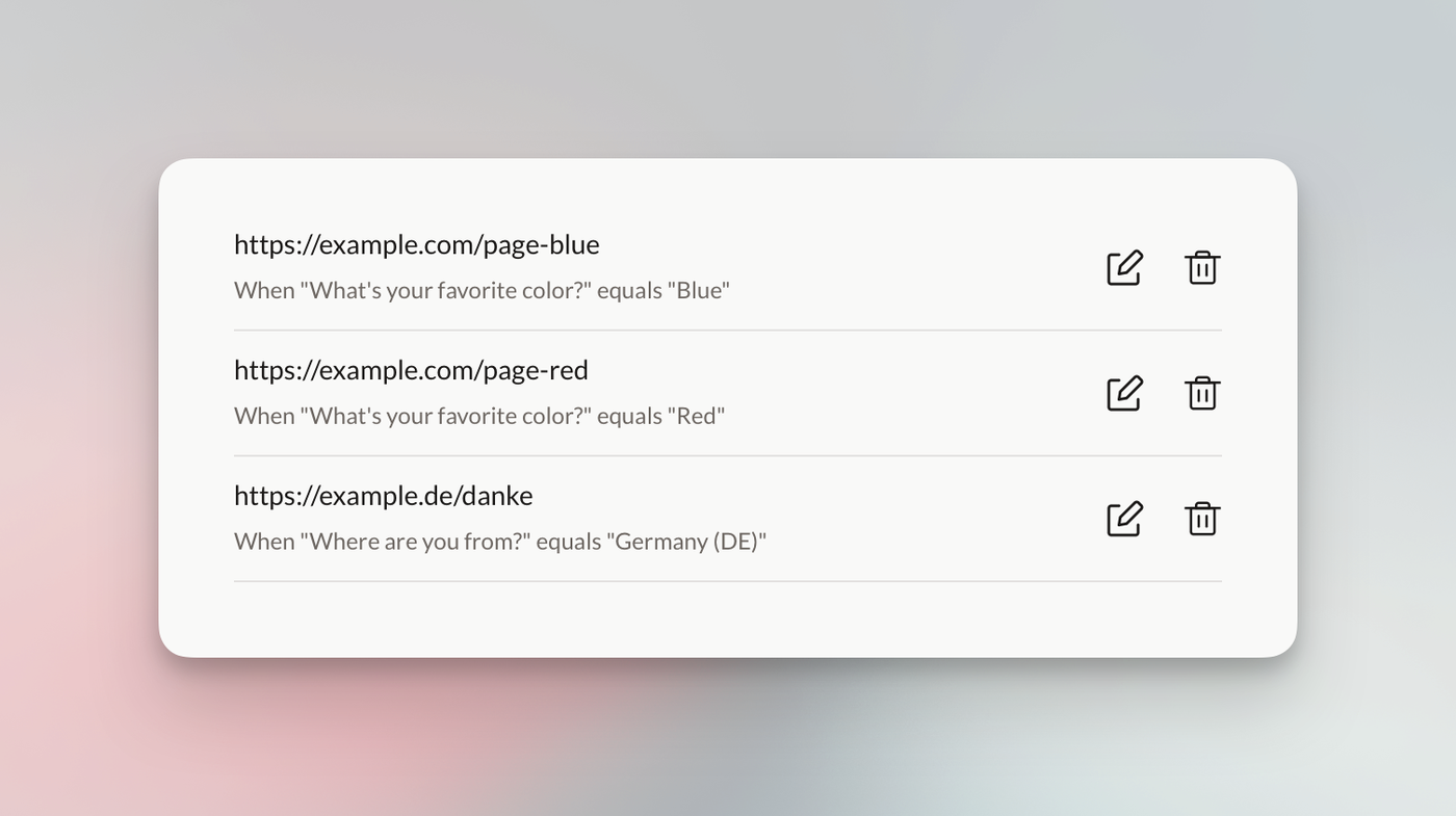 Conditional redirects do exactly what you might expect: they direct respondents to a specific URL after submitting a form based on what they have filled out or selected. You can create multiple redirects, and the first matching rule is used.